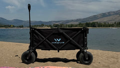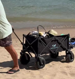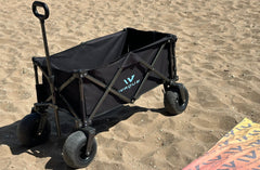 Designed to carry up to 220 pounds with ease, this wagon is ideal for moving heavy loads even on soft sand, thanks to its robust balloon tires built to withstand sharp rocks and high heat. Its tailgate enhances versatility by securely attaching umbrellas or longer items, rather than just carrying them on the wagon bed. Featuring a heavy-duty steel X-frame that folds effortlessly for convenient storage and transport, this wagon delivers reliable performance. The large 9-inch wheels ensure smooth movement over sand, grass, pavement, and rough terrain. Crafted with durable black fabric and a reinforced frame, it offers ample cargo space for beach trips, gardening, camping, and more. When folded, it measures 24 x 18 x 8 inches and includes ergonomic foam handles for comfortable handling.